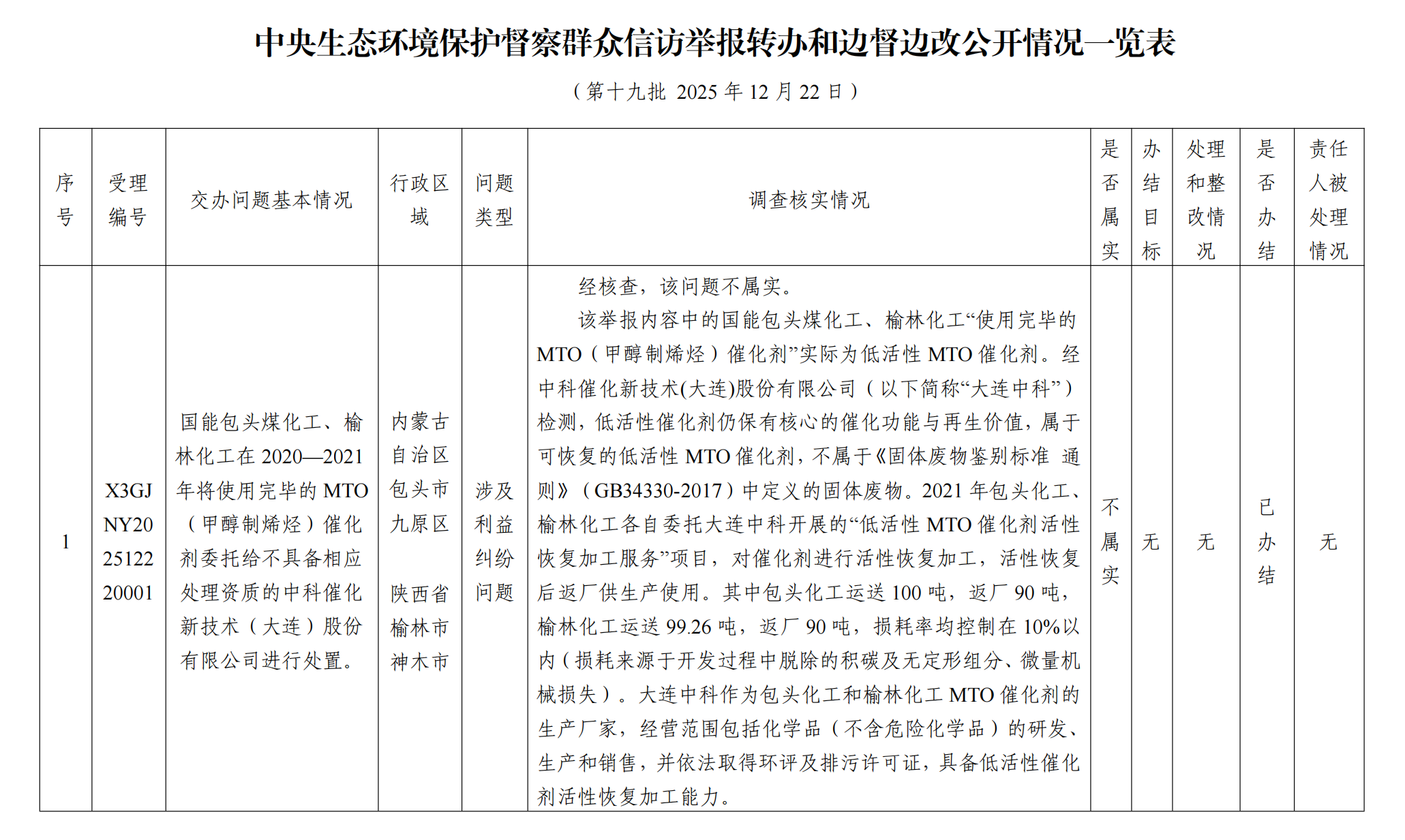 中央生态环境保护督察群众信访举报转办和边督边改公开情况一览表(第十九批 2025年12月22日)