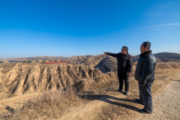 图为高西沟村党支部副书记高利东正在和村民一起瞭望远处的光伏板