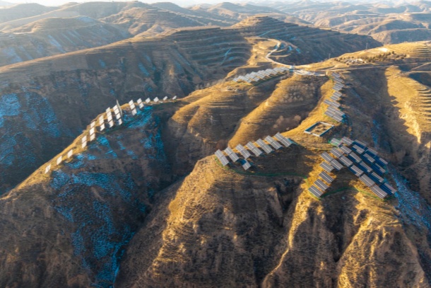 冬日,米脂县杨家沟与高西沟的山峁间,尽是沟壑纵横的苍茫,就在这一片苍茫之中,一排排深蓝色的光伏板错落有致地铺展在山坡上,在冬日暖阳的映照下熠熠生辉。
