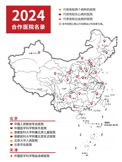 2024年,基金会继续与中国社会工作联合会合作,捐资2928万元,在全国范围内救助不少于1350名0-18岁的先心病和白血病患儿,其中在新疆地区救助不少于350名两病患儿;与中华慈善总会合作,捐资572万元,一是在全国范围内救助不少于200名0-18岁的先心病患儿;二是在基金会帮扶9县开展儿童先心病筛查等活动,资助受邀专家因筛查产生的往返交通、食宿等相关费用;三是对筛查活动确诊患儿实施个性化救助。