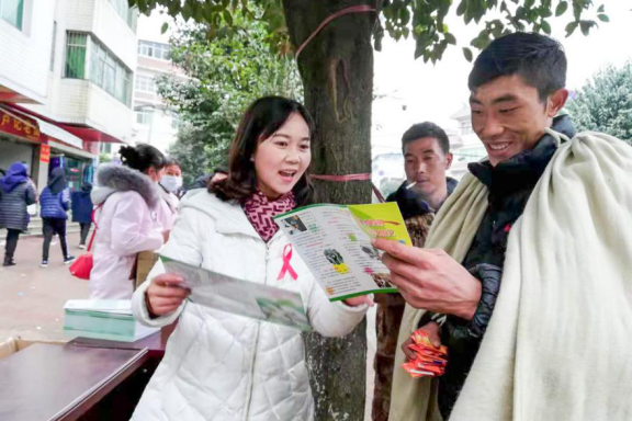 防艾宣传人员在街头向当地群众宣传防艾知识